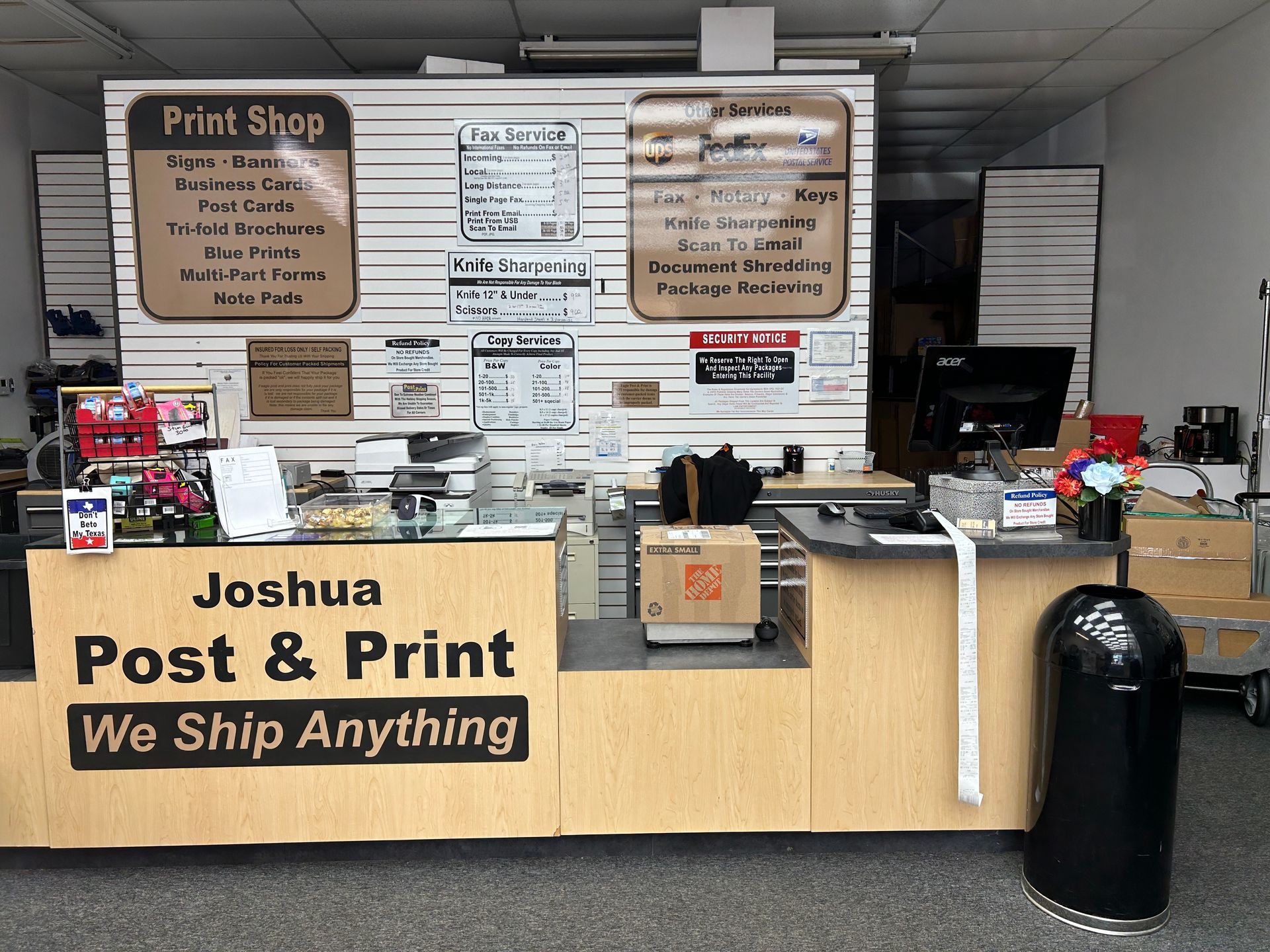 Joshua Post & Print is the go-to resource for packing, shipping, printing and business service needs of the residents and businesses of Crowley Burleson and Joshua tx. Our team of dedicated, professionally trained experts understands the meaning of Super-Star Customer Care—we focus on saving you time and money by ensuring you get the right products and services at the right price—in a single, quick visit.